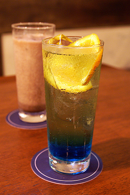 メニューの説明によると「ジンジャーエールをブルーハワイで割って、オレンジを飾り付けました。ストイックな強さの特Aランク闘士、関羽をイメージしたドリンクです。」というもの。