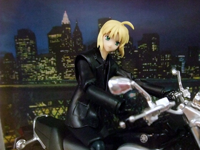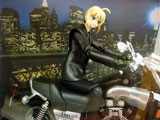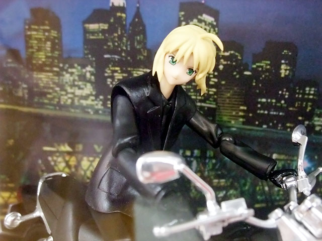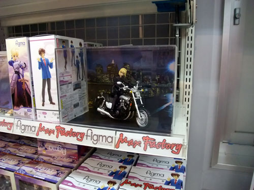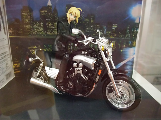 とらのあな本店にて、マックスファクトリー「figma Fate/stay night セイバー 甲冑Ver.」(AA)のヘッドパーツと「figma 涼宮ハルヒの憂鬱 古泉一樹 制服Ver.」(AA)のボディパーツを使用し、改造した、スーツ姿のzeroセイバーの改造例が展示されています。古泉の制服を真っ黒に塗装して、スーツにしたて、大型バイクにまたがった姿はイメージ通りですよ!後ろ髪も抜かりなし
