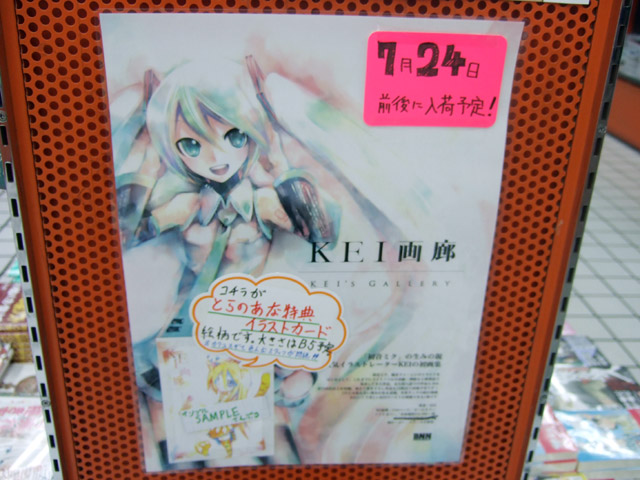 7月22日、画集「KEI画廊」(AA)が発売されました。これは、以前告知ポスターをお伝えした「初音ミク」の生みの親であるKEI氏の初の画集で、商品説明によると「初音ミク、鏡音リン・レンのイラストレーションをはじめとして、これまでにライトノベルの表紙など商業誌で発表してきた作品、また同人誌での作品も含め、計150点以上を掲載。」というもの。表紙はもちろん初音ミク。