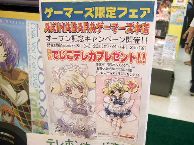 なお、POPによると『2008年7月22日(火)~25日(金)の期間中、本店にて5,000円以上商品をお買い上げ頂いたお客様に各日先着で「でじこ特製テレカ」をプレゼント!!』とのことで、そのサンプル画像も掲示されていました。