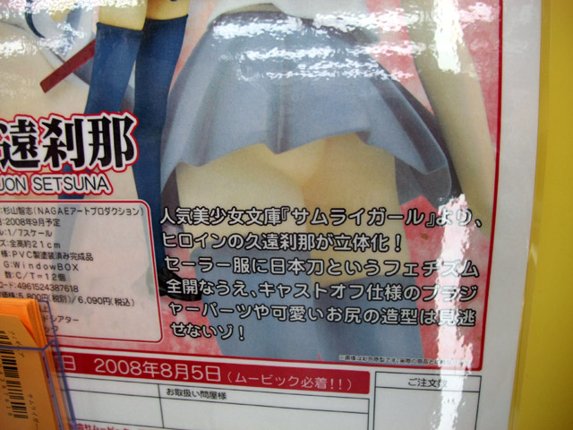 これは、以前WHF有明18FINALでの展示もお伝えした、</PCアニメーションノベル(18禁)もあるフランス書院のノベル『サムライガール』のキャラ「久遠刹那」を立体化したもので、ソリッドシアターの商品説明(18禁)によると【人気美少女文庫『サムライガール』より、ヒロインの「久遠刹那」が立体化!セーラー服に日本刀というフェチズム全開なうえ、キャストオフ仕様のブラジャーパーツや可愛いお尻の造形は見逃せないゾ!また、ソリッドシアターHP通販にてお買い求め頂いたお客様にはイラストのテレホンカードをプレゼント! 】と紹介されています。