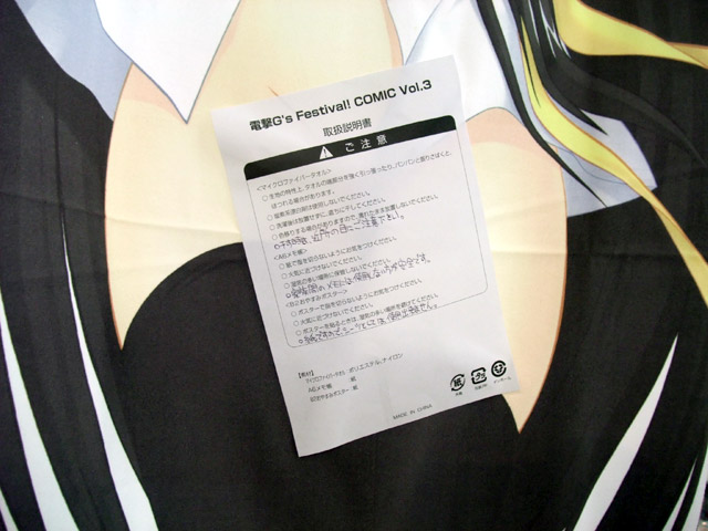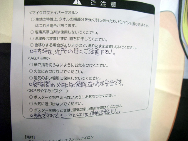 その注意書きの紙を良く見てみると、ゲーマーズ本店的に注意書きが足りないと思ったのか、MFタオルに「干す時は、近所の目にご注意下さい。」、A6メモ帳に「家族間のメモには使用しない方が安全です。」、B2おやすみポスターに「紙ですので、シーツとしては使用できません。」との注意書きが追加されてましたw