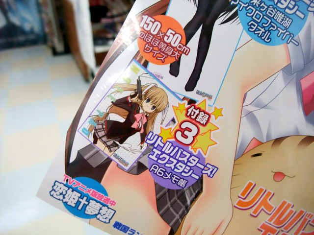 7月26日、雑誌「電撃G’s Festival Comic (ジーズフェスティバル・コミック) Vol.3」(AA)が発売されました。これは「来ヶ谷唯湖 MFタオル」他2点の付録のついた「リトルバスターズ!エクスタシー」の特集号。中には付録の取り扱い注意書きも封入されてますが、ゲーマーズ本店では注意書きが足りないと思ったのか「干す時は、近所の目にご注意下さい。」等が追加されてましたw