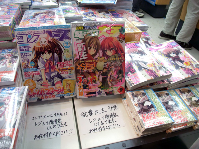 7月26日、先月リニューアルした雑誌「電撃大王 2008年 09月号」(AA)が発売されました。今月号から倉田英之氏×鳴子ハナハル氏の『ノイジィ・ガール』がスタートしたからか、とらのPOPでは「ちょw大王の流れ(売れる速度)早すぎ!!w *品切れも時間の問題か・・・?」とかかれ、かなり売れてるみたい。他、みやびや「魔法少女アイ アソビット限定版」の予約開始等まとめて。