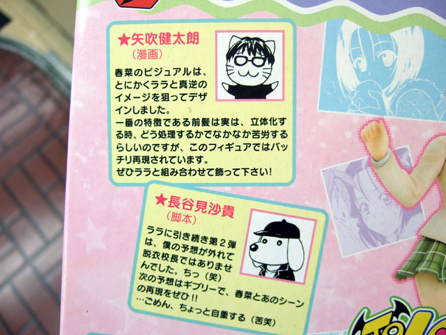 これは、以前キャストサンプルレビューをお伝えした事もある、第1弾の「ララ」(AA)に続き「To LOVEる」のキャラ「西連寺春菜」を立体化したもので、パッケ裏面の原作者・矢吹氏のコメントによると『春菜のビジュアルは、とにかくララと真逆のイメージを狙ってデザインしました。一番の特徴である前髪は実は、立体化する時、どう処理するかでなかなか苦労するらしいのですが、このフィギュアではバッチリ再現されています。ぜひララと組み合わせて飾ってください!』と紹介されています。