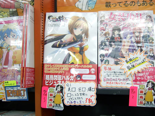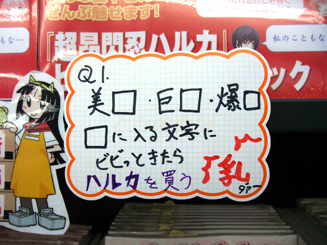 7月24日には発売されている、ムック本「超昂閃忍ハルカ ビジュアルファンブック」(AA)ですが、とらのあな1号店で「美□・巨□・爆□ □に入る文字にビビっときたらハルカを買う 乳ダァー」と書かれたPOPが掲示されていました。