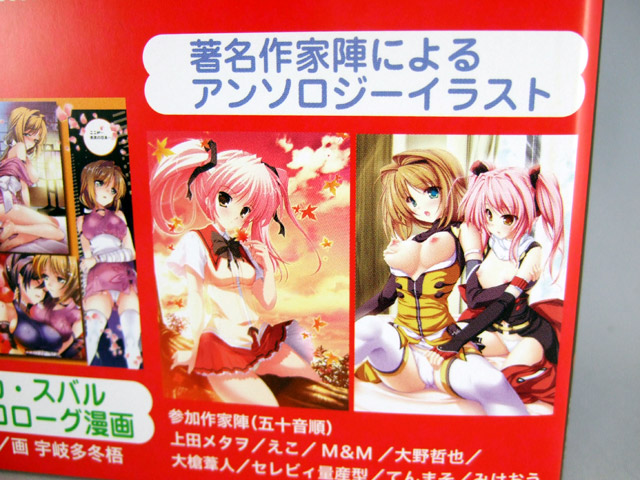 他、カバー折り返しで両方全裸だったり、キャラ紹介ショートコミックでさっそく貫かれてたり、ゲーム中のエロシーンもでっかく掲載されてたり、ゲストイラストも直球だったり、どう見てもアウトですw