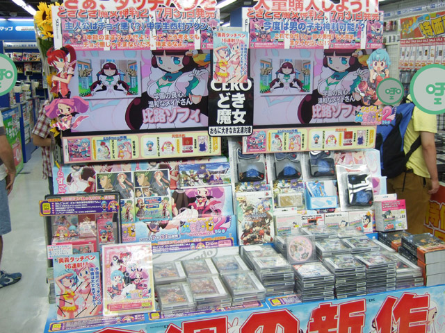 DS どきどき魔女神判!2の「初回限定版」(AA)、「通常版」(AA)が7月31日発売となっていますが、ソフマップAM館では、28日から店頭での展開を開始しています。29日にはさらに「奥義タッチペン16連射!! 予備用のタッチペンの準備は大丈夫ですか?」として、乳やおへそにタッチマークの付いたイラストPOPが追加されていましたw ちなみにタッチペン。結構種類あります。