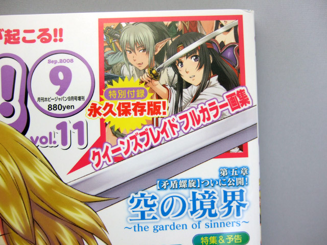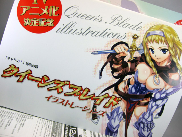7月30日、雑誌「キャラの! 2008年 09月号」(AA)が発売されました。今回、付録として「クイーンズブレイド フルカラー画集」が封入されてます。内容は、小説挿絵のフルサイズイラストや、メルファの乳首透け全身タイツ、パンツ破れたカトレアと女の子みたいなパンツの息子、トモエの下着姿等の「キャラの!トレーディングキャラプレート」イラスト等、かなりエロに充実した内容!