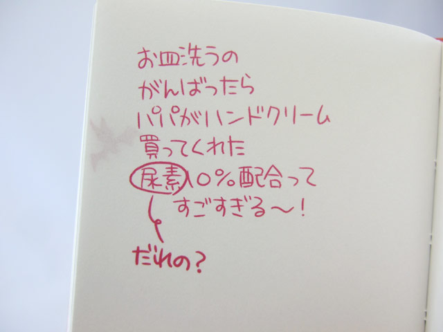 いくつかころんのメモが書かれていて、『お皿洗うのがんばったらパパがハンドクリーム買ってくれた 尿素(だれの?)10%配合ってすごすぎる~!』とか書かれていますw