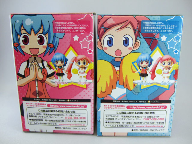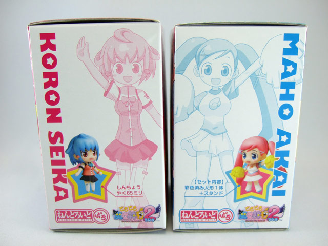 ねんどろいど・ぷち2体(赤井まほ・聖花ころん)のパッケ表裏と側面。