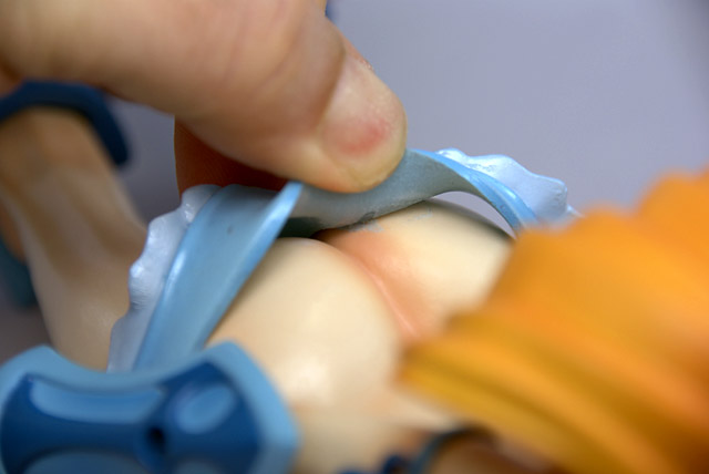 結構強力に接着されていますが、パンツ側は万一破損しても、予備パーツがついているので、お尻を傷つけないように慎重にマイナスドライバーなどでパンツ側を持ち上げるように、接着を剥がしていきます。