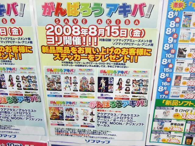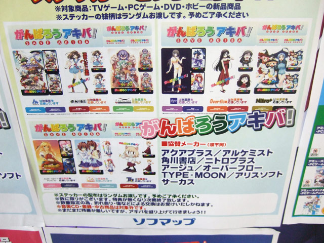 ぷちアキバ情報ソフマップAM館で8月15日より新品商品を買うと限定ステッカーがもらえる「がんばろうアキバ!ステッカープレゼント」があるそうです。ステッカーの絵柄はこちら