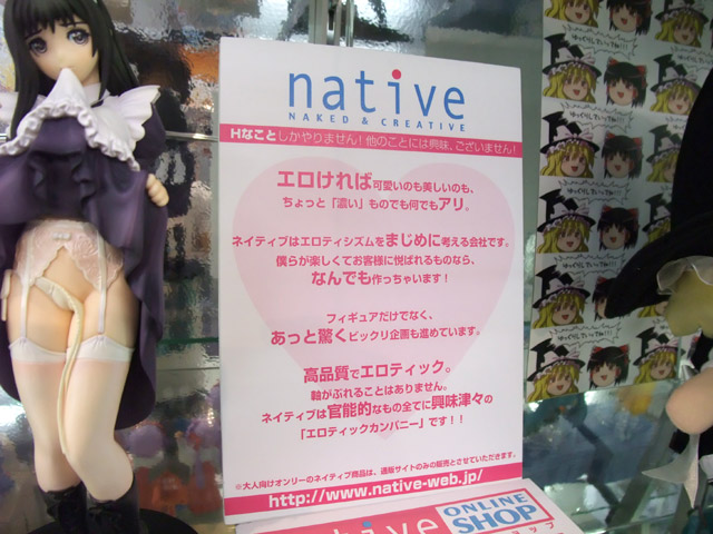ネイティブは、掲示されていたPOPによると『Hなことしかやりません!他のことには興味、ございません!エロければ可愛いのも美しいのも、ちょっと「濃い」ものでも何でもアリ。ネイティブはエロティシズムをまじめに考える会社です。僕らが楽しくてお客様に悦ばれるものなら、なんでも作っちゃいます!フィギュアだけでなく、あっと驚くビックリ企画も進めています。高品質でエロティック。軸がぶれることはありません。ネイティブは官能的なもの全てに興味津々の「エロティックカンパニー」です!!』というメーカーですw