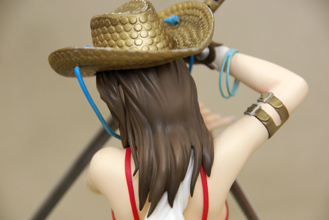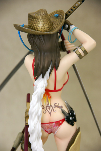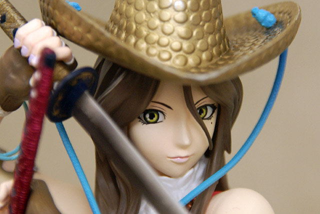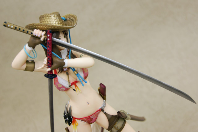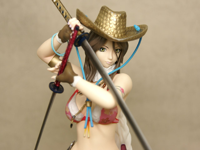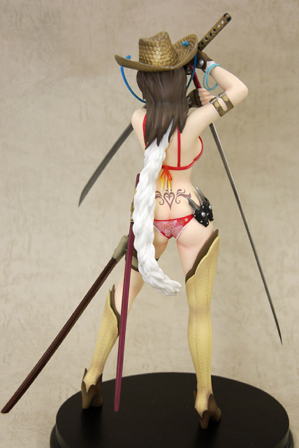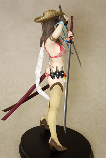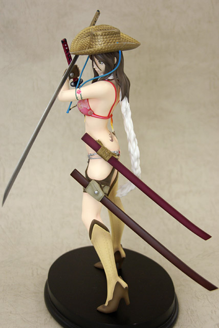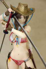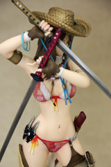 ぶった切り系アクションゲーム「お姉チャンバラvorteX -忌血を継ぐ者たち-」より最凶ヒロイン「彩」をスタイリッシュに立体化!!商品パッケージイラストに使用されている不敵な笑みを浮かべ二本の刀を構えたポージングをモチーフとして造形。戦闘服であるビキニはお色気満点で肉感溢れるボディーラインを妖しく際立たせ、特徴的な花柄や柔肌に入れられるタトゥーも細かく再現、各所に装備された刀や帽子、小物類もリアルさに拘った細かな造形となっている。
