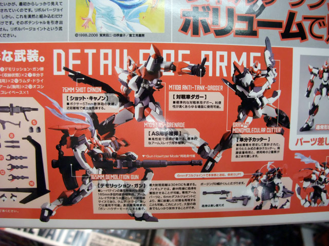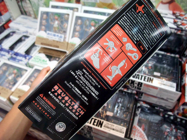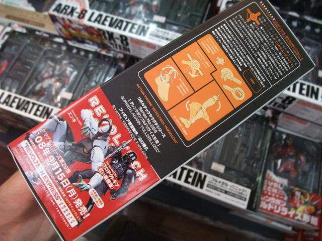 8月15日はお盆となるので、いつもより少し早めの8月13日に、海洋堂 リボルテックヤマグチ「No.58 グレンラガン フルドリルライズ形態」(AA)と「No.59 ARX-8 レーバテイン」(AA)の2種がアキバで発売されていました。「フルメタル・パニック!」のメカである「レーバテイン」は「リボルテックヤマグチ最大ボリュームの武装」を謳われていて、パッケサイズも過去最大でした。