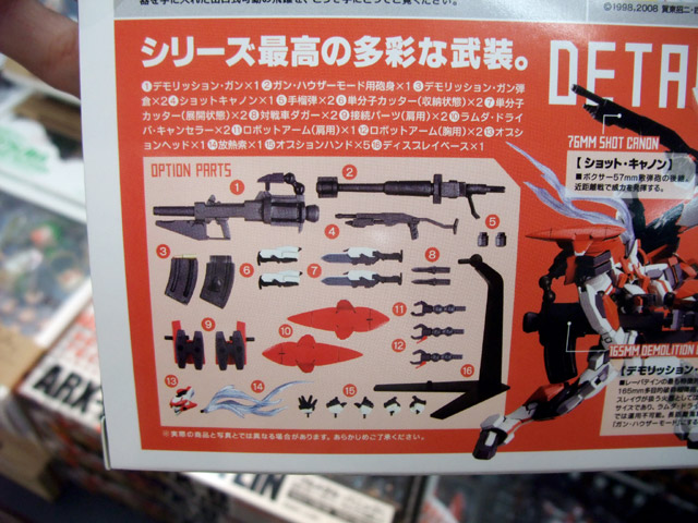 デモリッション・ガン×1、ガンハウザーモード用砲身×1、ショットガン×1、肩部増設ユニット×2、単分子カッター×2、単分子カッター(収納状態)×2、対戦車ダガー×2、手榴弾×2、接続パーツ(肩用)×1、ロボットアーム(肩用)×1、ロボットアーム(胸用)×2、オプションヘッド×1が付属。