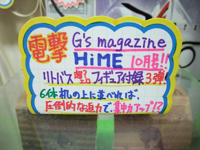 電撃G’s magazineと電撃HIME8・9・10月号に付属する『リトルバスターズ!EXお風呂フィギュア』の「電撃HIME 10月号」付属の「三枝葉留佳」と、「電撃G’smagazine 10月号」付属の「朱鷺戸沙耶」のサンプル展示が、8月号分、9月号分のサンプル展示のあったメロンブックスにてPOPに『電撃G’s magazine 電撃HIME 10月号!!リトバス超?エロフィギュア付録3弾!6体机の上に並べれば、圧倒的な迫力で、集中力アップ!?』と書かれ開始しています。