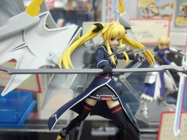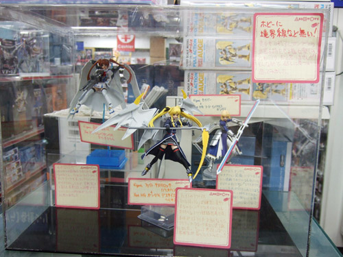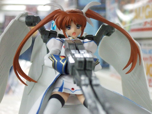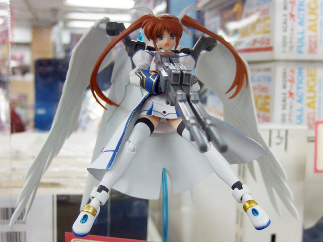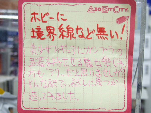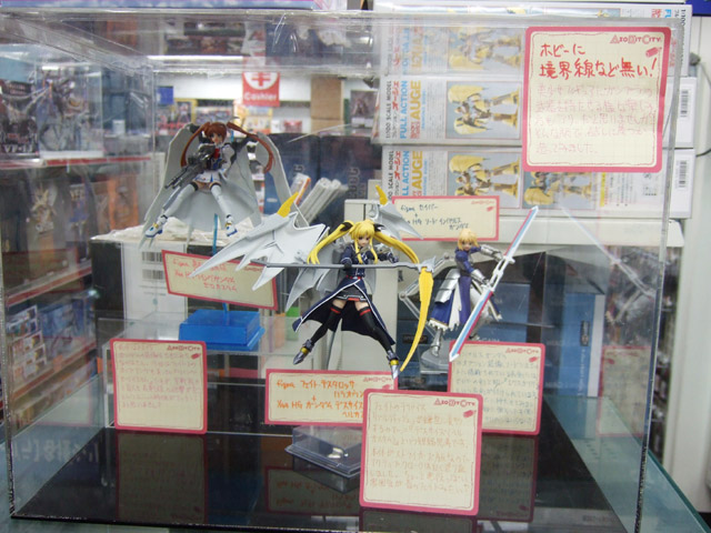 以前、「管理局の白い悪魔(なのは)」が連邦の白い悪魔の装備でテイクオフしていたキャラシティ2Fにて、POPに「ホビーに境界線など無い!美少女フィギュアにガンプラの武器を持たせる様な楽しみ方も”アリ”だと思いませんか?そんな訳で試しに幾つか造ってみました。」という、figmaにガンプラパーツをあわせた展示がありました。