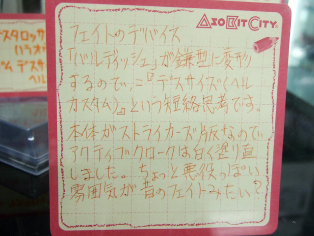 フェイトのデバイス「バルディッシュ」が鎌型に変形するので、=『デスサイズ(ヘルカスタム)』という短絡思考です。本体がストライカーズ版なのでアクティブクロークは白く塗り直しました。ちょっと悪役っぽい雰囲気が昔のフェイトみたい?