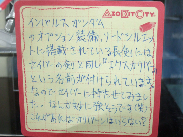 インパルスガンダムのオプション装備、ソードシルエットに搭載されている長剣にはセイバーの剣と同じ『エクスカリバー』という名前が付けられています。なのでセイバーに持たせてみました。なんか妙に強そうです(笑)これがあればカリバーンはいらない?