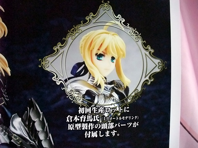これは、ポスターの解説によると『新興フィギュアメーカー”Gift”より、遂にPVC完成品ラインがスタート! 待望の第一弾は「Fate/stay night」より最優のサーヴァント「セイバー」です。戸田聡氏(夢のカグツチノ公国)による原型は、繊細さを表現すると同時に騎士王たるセイバーの剛健さも見事に表現しました。また、初回生産ロットにのみ、倉本育馬氏(ミリメートルモデリング)制作による差し替え可能な頭部パーツが特典として付属。他ではありえないコラボレーションをお見逃し無く。』という、新規メーカーGiftのPVC完成品フィギュア第1弾となるものです。