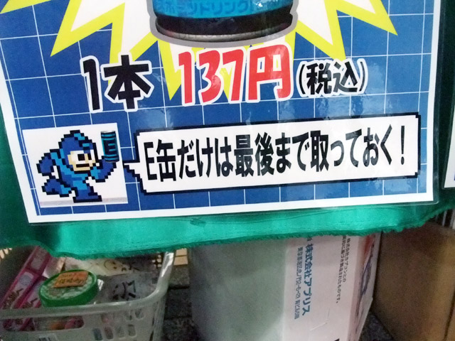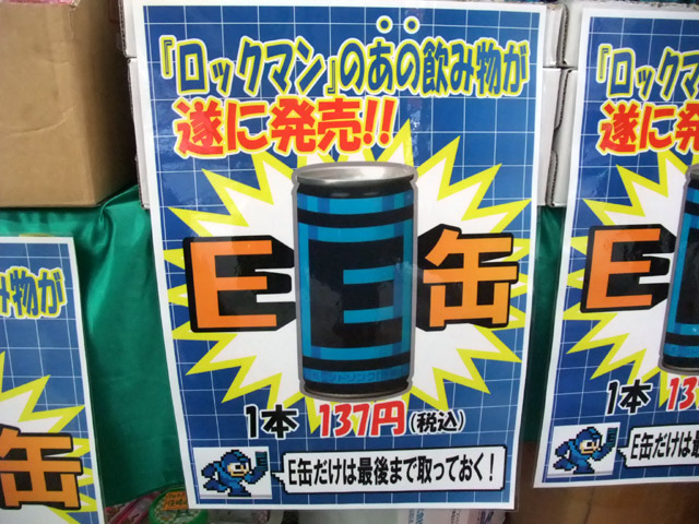 これは「ロックマンシリーズ」に登場する、ゲーム業界用語辞典さんによると「ロックマンに出てくる体力全回復アイテム。~初登場の2では最大4個、3~7は最大9個までストックできる。」という「E缶」をモチーフとしたローヤルゼリー配合のスポーツドリンクです。