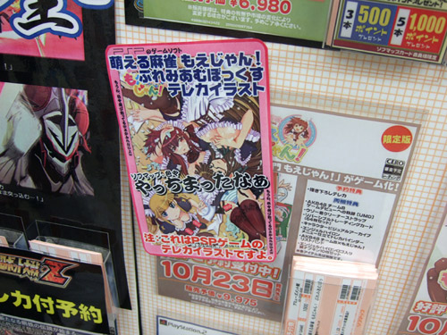 PSP「萌える麻雀 もえじゃん! ぷれみあむぼっくす」(SA)が10月23日に発売予定となっていますが、ソフマAM館で、ソフマ特典テレカのイラストが公開されてます。イラストは、PSPの一般ゲームの特典ですが「もうね、色々飛び散ってるのとかふれないよw」という、白濁したものが体中に飛び散ったりしていて、オススメポイント?には「ソフマップやっちまったなぁ」矢印もw