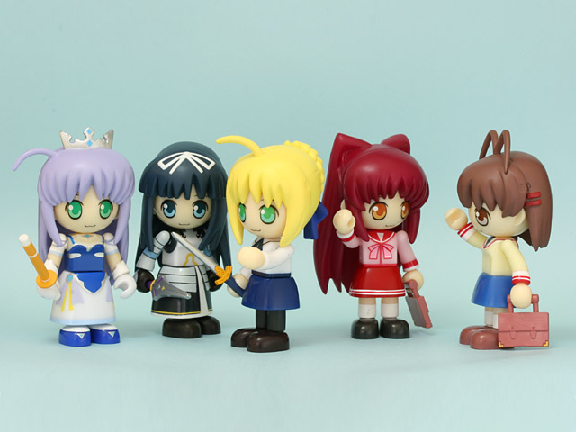 セイバー(Fate/stay night)、上杉謙信(戦国ランス)、向坂環(ToHeart2)、古川渚(CLANNAD)、フィーナ・ファム・アーシュライト(夜明け前より瑠璃色な)の5キャラ×3パターンの全15種類。