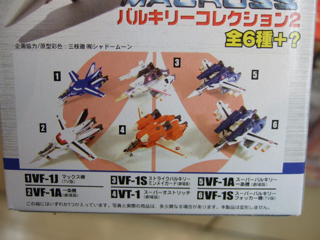1/144スケールで、VF-1A一条機(劇場版)、VF-1Jマックス機(テレビ版)、VT-1スーパーオストリッチ、VF-1Jミンメイガード、VF-1Sフォッカー機(テレビ版)、VF-1A一条機(テレビ版)の全6種+レアカラー1種。