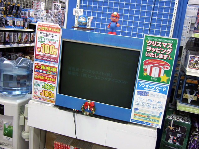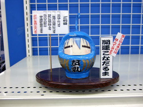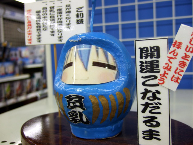 ソフマップアミューズメント館4Fの買取コーナーにあるモニターの上には、「悲しいときには拝んでみよう」として、結構前から「らき☆すた」のこなたをモチーフにした「開運こなだるま」が設置されてます。ご利益は「足が速くなります」「一夜漬けが得意になります」「貧乳に自信が持てます」「自分の中の新たな萌え属性を発見できます」「ただし身長が止まります」等。