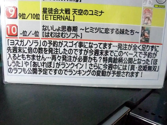 POPによると【「ヨスガノソラ」の予約がスゴイ事になってます・・・発注が全く足りずに先週末に倍の数を発注したのですが今週末までこのペースで予約が入るともちません・・・再々発注が必要かも?】とのことです。