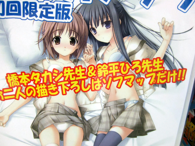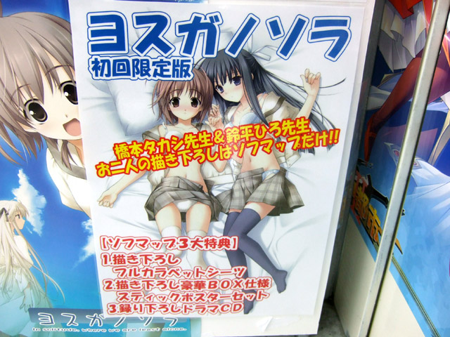 12月5日に発売予定で、コミックマーケット74にて抱き枕の販売などもあった、SphereのエロゲPCソフト「ヨスガノソラ 初回限定版」(AA)ですが、発売まで1ヶ月を切ったこともあり、アキバの各ショップで大きく展開&各ショップ特典のサンプルイラストの掲示が開始していました。