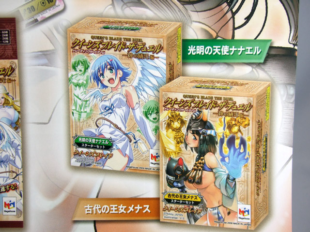 メガハウス「クイーンズブレイド・ザ・デュエル 神の威光編」のチラシが、とらのあな本店で頒布されていました。これは、第1弾に「レイナ」(AA)、「ユーミル」(AA)がある、メガハウス販売のカードゲーム「クイーンズブレイド・ザ・デュエル」の第2弾となるものです。今回のスターターセットは「ナナエル」(AA)と「メナス」(AA)となるようで、チラシには描き下ろしイラストのサンプルも。