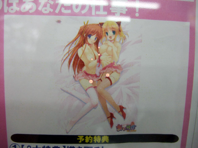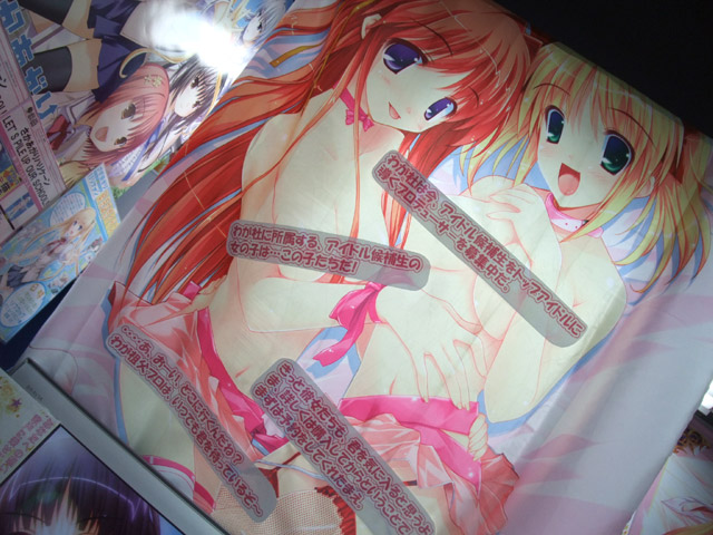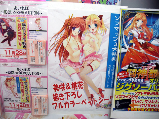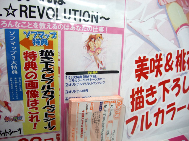 以前、超巨大M字開脚POPの掲示もあった、SIESTAのエロゲPCソフト「あいれぼ ~IDOL☆REVOLUTION~」(SA)ですが、ソフマップAM館で、ソフマップ特典のひとつ「美咲&桃花 描き下ろしフルカラーベットシーツカバー」のサンプルイラストと、現物サンプルの展示が開始しています。現物サンプルの乳部分は、文字で隠されていましたが、ほんのり透けてましたw