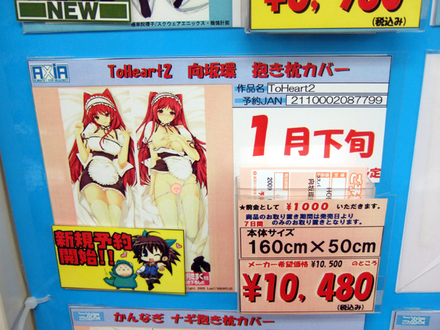 これは、以前ゲームシティで告知準備してたのをお伝えした、「ToHeart2 XRATED」のキャラ「向坂環」をメイド服姿で抱き枕カバーにしたもので、アクシアの商品説明によると
