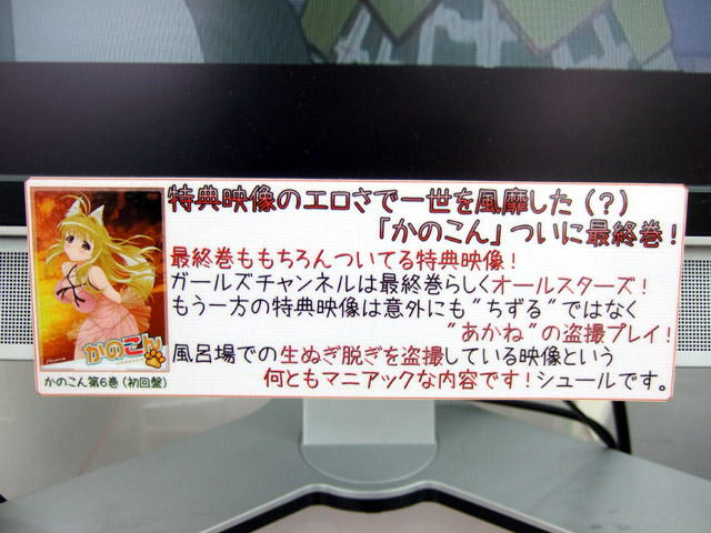 11月20日、DVD「かのこん 第6巻 初回限定版」(AA)が発売されました。とらのPOPで【特典映像のエロさで一世を風靡した(?)「かのこん」ついに最終巻!最終巻ももちろんついてる映像特典!ガールズチャンネルは最終巻らしくオールスターズ!】とあるように、特典映像はこんなのやこんなのやこんなの等、最後を締めくくるにふさわしい、おっぱい祭り状態!w