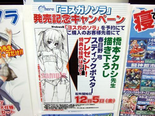 関連:ヨスガノソラ(ゲーム) – 公式/橋本タカシ氏 – Wikipedia/鈴平ひろのお仕事ぶろぐ – 鈴平ひろ氏blog/「予約がスゴイ事になってます」 エロゲ「ヨスガノソラ」 アキバ各ショップ特典まとめ