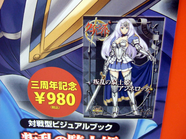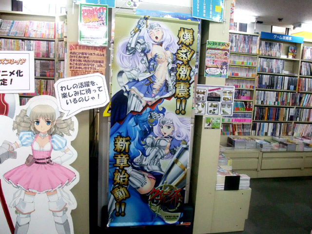 K-BOOKSでは、三周年記念価格で、税込980円で発売予定の、対戦型ビジュアルブック「クイーンズブレイド リベリオン 叛乱の騎士姫アンネロッテ」(AA)の巨大告知タペストリーの掲示がされていました。