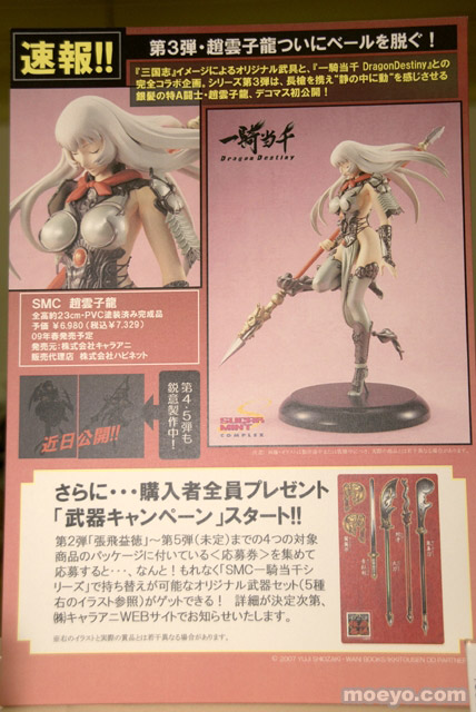 第2弾「張飛益徳」~第5弾(未定)までの4つの対象商品のパッケージに付いている<応募券>を集めて応募すると・・・、なんと!もれなく「SMC 一騎当千シリーズ」で持ち替えが可能なオリジナル武器セット(5種右のイラスト参照)がゲットできる!詳細が決定しだい、(株)キャラアニWEBサイトでお知らせいたします。