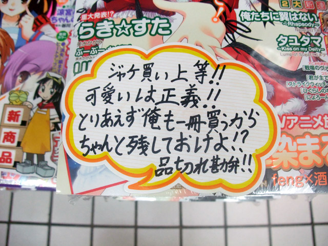 とらのあな1号店のPOPによると【ジャケ買い上等!!可愛いは正義!!とりあえず俺も一冊買うからちゃんと残しておけよ!?品切れ勘弁!!】と書かれていました。
