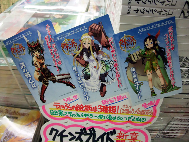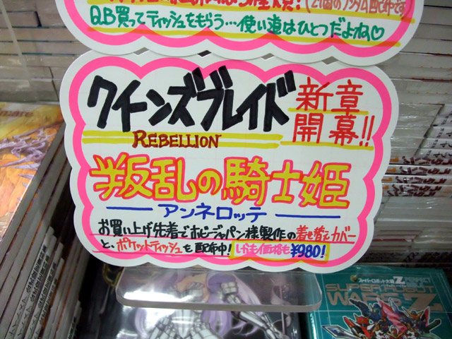 以前お伝えした告知POP通り、11月27日に、K-BOOKSなどのアキバのいくつかの店舗で対戦型ビジュアルブック「クイーンズブレイド リベリオン 叛乱の騎士姫アンネロッテ」が発売されました。