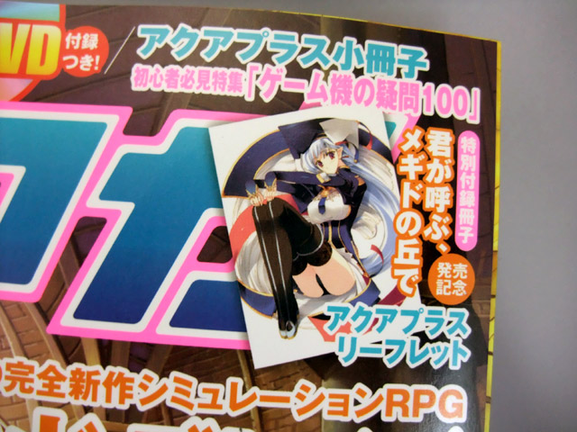 こちらは、【「メギド」の最新情報に加え、「ToHeart adplus」や「ティアーズ・トゥ・ティアラ」のアニメ作品など、アクアプラス関連の最新情報をこれでもかと紹介しています。】という、特別付録冊子「アクアプラス リーフレット」の表紙と裏表紙。