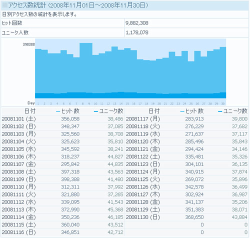 総ヒット数は988万2308。総ユニーク数は117万8078でした。トップページへのアクセス145万30PV。(内、新環境トップは144万6593、旧ライブドアブログトップは3437)