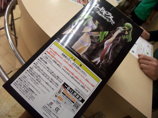 12月1日、バンプレスト「一番くじプレミアム コードギアス反逆のルルーシュR2」の販売が、アキバで開始されました。これは、以前宮沢模型展示会08秋での展示もお伝えした、必ず何かが当たる、一回800円の外れなしのくじ。A賞は、C.C.プレミアムフィギュア。なお、抽選で100名に「C.C.レジンキャストキット」が当たる「ダブルチャンスキャンペーン」もあるようです。