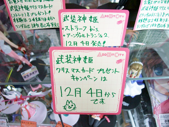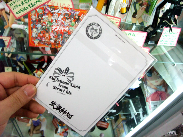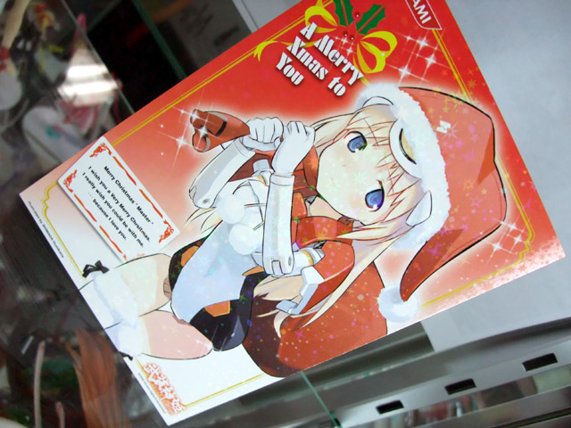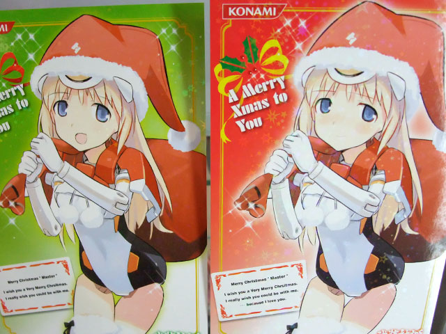 12月4日発売予定のコナミ 武装神姫「アーンヴァル トランシェ2」と「ストラーフ bis」のサンプル展示が、キャラシティととら本店にて開始してます。キャラシティでは、同じく12月4日から開催予定の「クリスマスカードプレゼントキャンペーン」で頒布予定のクリスマスカードのサンプルも展示してました。画像はアーンヴァル トランシェ2のクリスマスカードサンプル。
