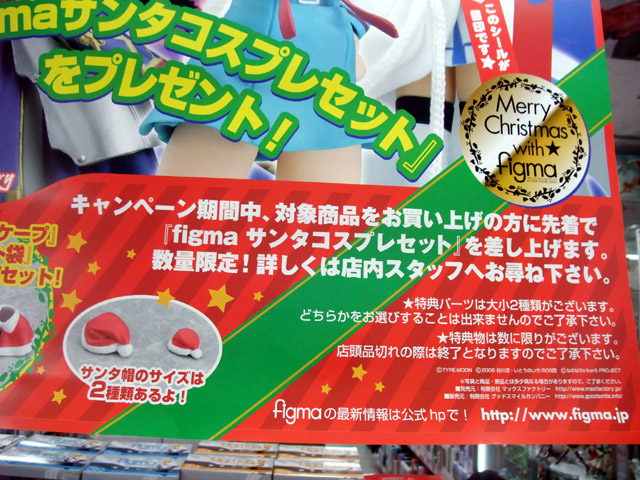 figmaを買うと、figma用のサンタコスプレセットがもらえる「figmaクリスマスキャンペーン」が12月10日から開始となるようで、キャラシティで告知ポスターが掲示されていました!アキバのいくつかのショップでは、サンタコスをつけたfigmaのサンプル展示も。ミカタンブログさんでも、figmaやねんどろいどにつけた装着例紹介や、figma用ペーパークラフトの紹介が!