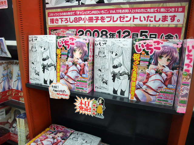 12月5日、雑誌「チャンピオンRED いちご 2009年 1月号」が発売されました。今月号で2周年となるようで、表紙には「祝!!創刊2周年感謝号!!」とも。また、「作品のほとんどは18禁レヴェルの内容」や、表紙めくったらいきなり「くぱぁ」だったりしたことからか、とらのあな本店のPOPでは「未成年にオススメ出来ない雑誌」とのことw ちなみに今月はこんな感じ。