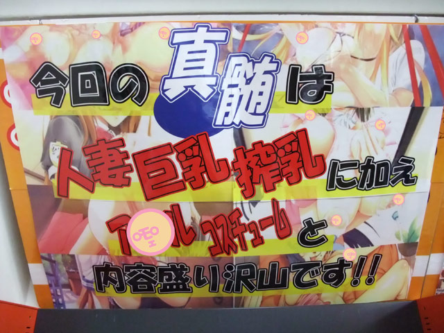 12月6日、大人向け合同誌「真髄 Vol.5~8」の4冊がいっせいに発売されました。これは、以前Vol.3/Vol.4発売をお伝えした、「巨乳・人妻・搾乳」がテーマの、とらのあな発行の大人向け合同誌で、POPによると、今回は「ア○ル・コスチューム」もテーマに追加。4冊がまとまった「真髄初回限定版(BOX 2)」は、開店前に100人以上並んで瞬殺だったみたいです。
