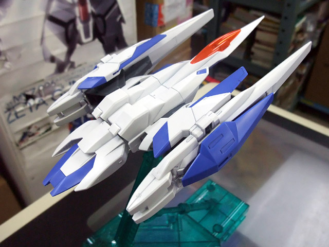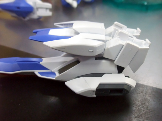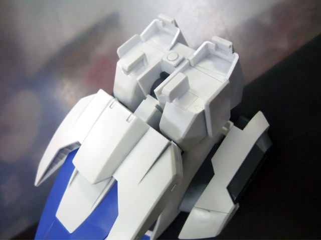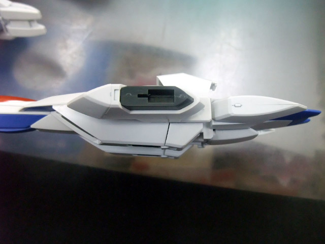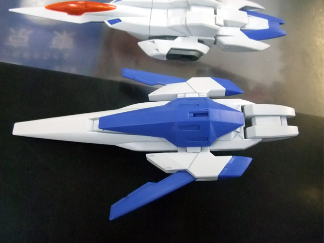 主翼を外した本体も、尻尾部分を折り曲げて変形させると、別売りの「1/100 ダブルオーガンダム」との接続ダボがでてきます。
